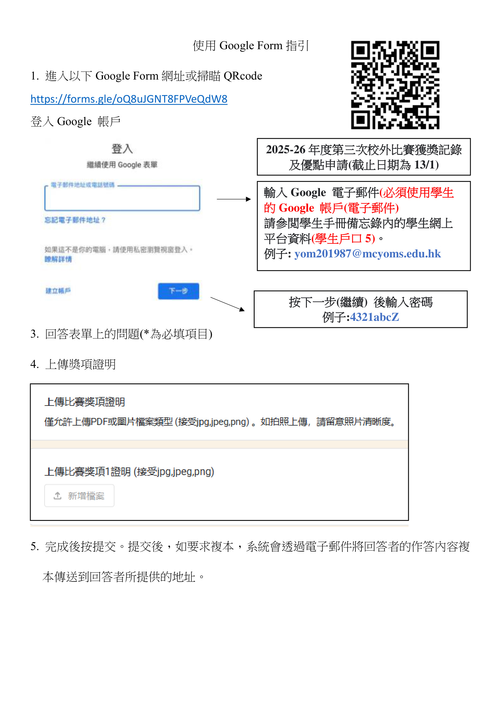 (例:yom######@mcyoms.edu.hk)方可登入頁面]。 - 如未能以電子方式申請,請聯絡班主任領取紙本表格,填妥表格後連同獎項證明交回負責老師辦理。(表格亦需依指定呈報日期向班主任申請)